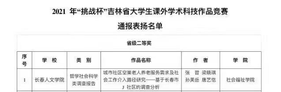 近日,由共青团吉林省委、吉林省教育厅、吉林省科学技术协会、吉林省员工联合会主办,2021年“挑战杯”吉林省老员工课外学术科技作品竞赛在长春中医药大学落下帷幕。经过前期多轮的专家评审以及现场答辩,公司张哲、梁晓琪、孙美岳、唐艺恺四名同学组成的课题组在李淼老师一对一指导下最终凭借“城市社区空巢老人养老服务需求及社会工作介入路径分析——基于长春市J社区的调查分析”这一项目在“哲学社会科学类调查报告”类别中荣获省级二等奖。